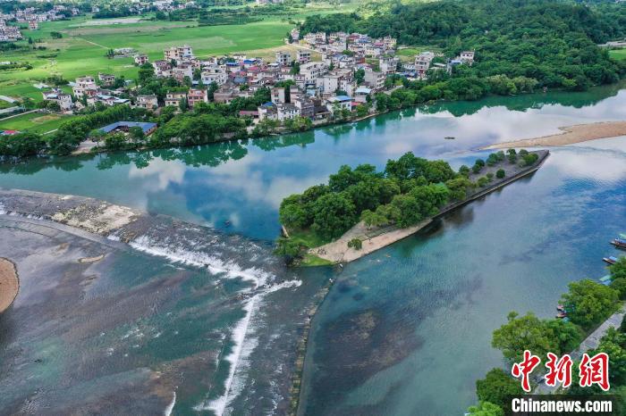 航拍灵渠铧嘴和“人”字形水坝。(无人机照片) 唐梦宪 摄