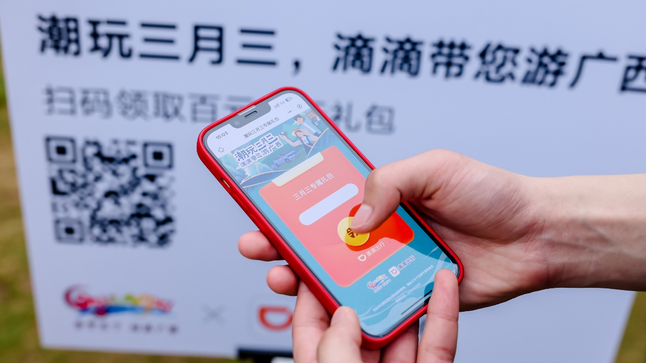 4月11日,在青秀山举办的“广西三月三·八桂嘉年华”开幕式活动中,“滴滴券包站”惊喜亮相现场,吸引众多游客现场打卡,扫码领取滴滴百元出行消费券包和周边礼品。