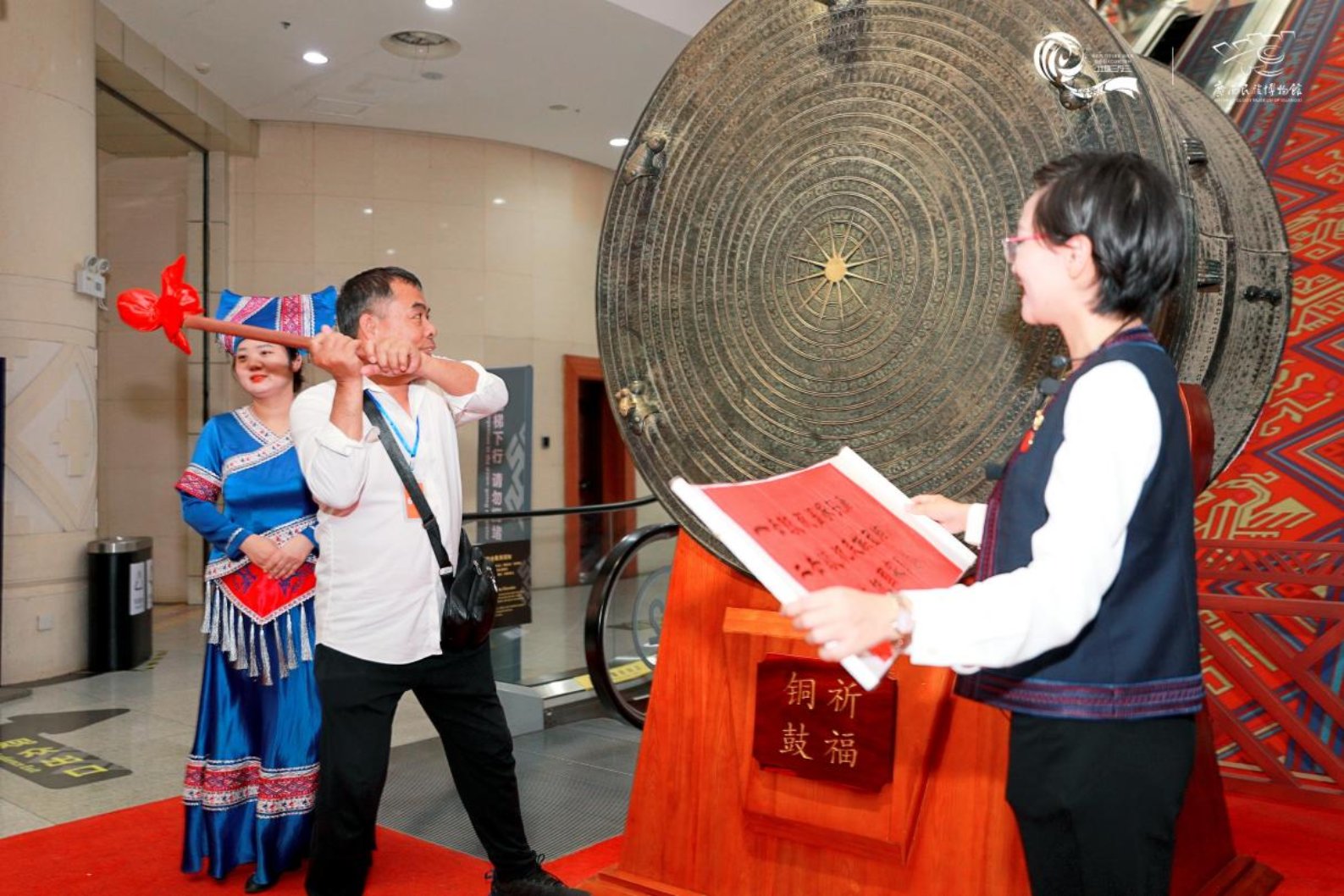 “到民博 闻鼓声”击鼓祈福活动在节日期间持续举办,每天由前三名进馆的幸运观众敲响铜鼓,鼓声隆隆,祈愿人民平安喜乐,祖国繁荣昌盛。