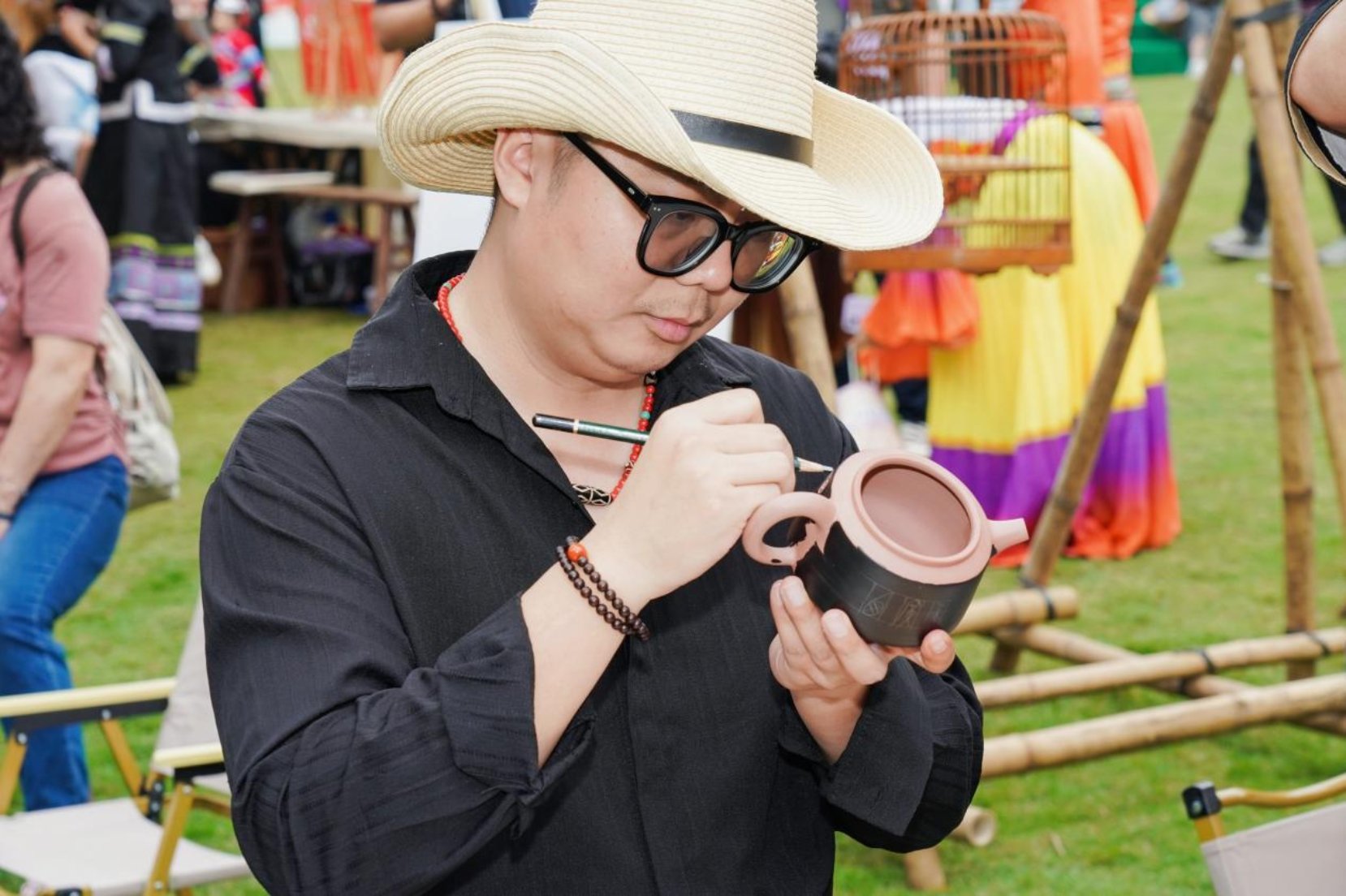 饱餐一顿后,穿越茂密的竹林,循着石板路一直向前,一片空旷的草地赫然呈现,这便是“壮美陶器”非遗技艺工坊、“非遗传艺”研学小课堂的所在地,这里展现着八桂大地各民族的审美情趣和艺术创造。坭兴陶制作技艺、壮族织锦技艺、金秀瑶族灯草灸疗法、苗族服饰制作技艺、右江壮族麽乜制作技艺等十余项非遗体验项目各具特色,让市民游客得以与非遗技艺近距离接触、与非遗传承人面对面学艺,延伸了非遗活态传承的更多可能性。