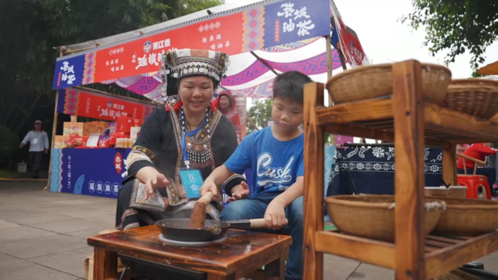 穿过一座酒庄,游客便来到了“广西美味”非遗美食体验区,广西非遗美食的各大摊点分列道路两旁。五色糯米饭、象州菜包、北海虾饼、巴马香猪、横州脆皮茉莉鸡……琳琅满目的桂菜香味四溢,引得诸多“吃货”朋友驻足品尝。这其中当然少不了入选人类非物质文化遗产代表作名录的恭城油茶。在非遗传承人的指导下,游客可以试着泡一杯地道的油茶,了解这道美食背后的故事和制作过程,细细品味其由苦入甘的口感,探寻它备受无数人喜爱的“独到配方”。