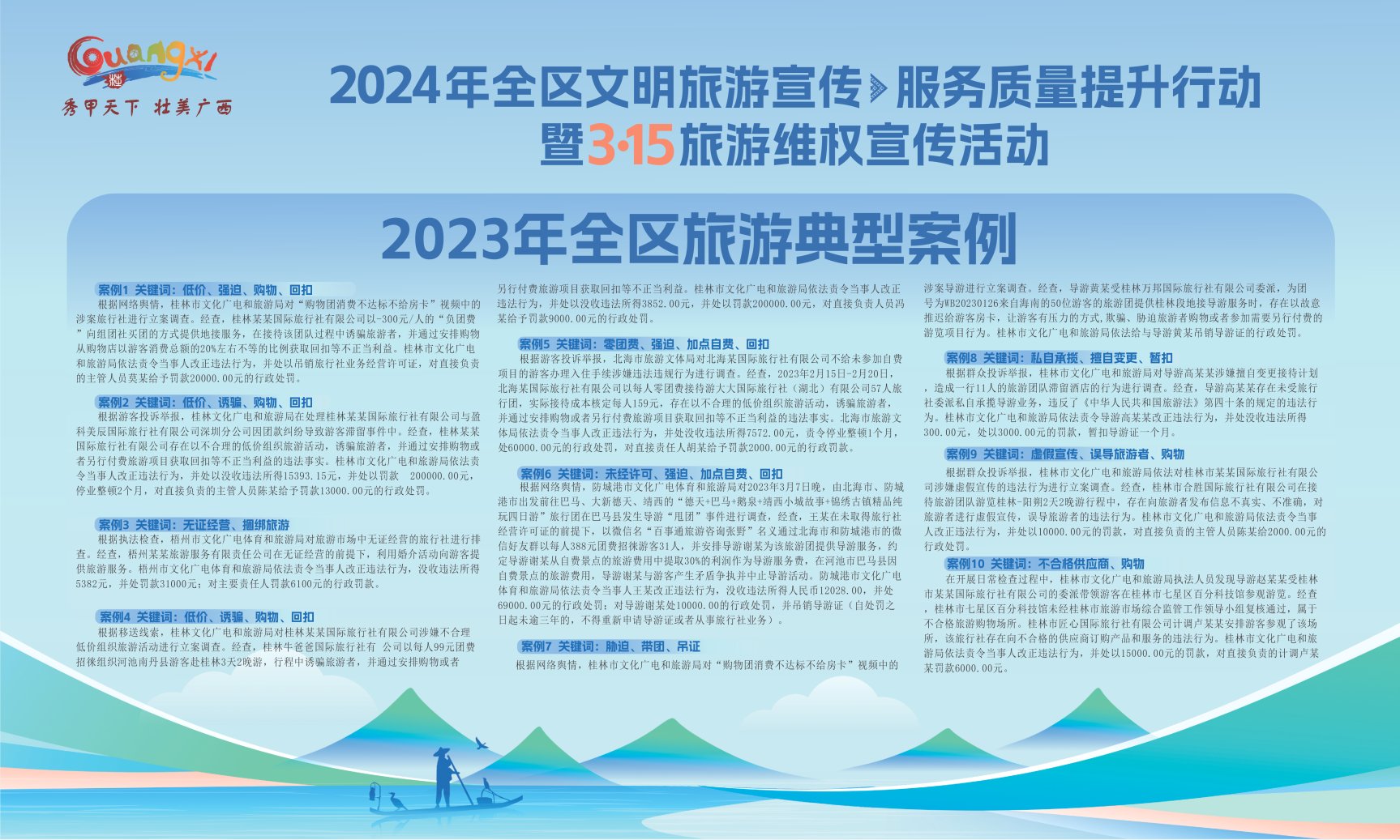 根据网络舆情,桂林市文化广电和旅游局对“购物团消费不达标不给房卡”视频中的涉案旅行社进行立案调查。经查,桂林某某国际旅行社有限公司以-300元/人的“负团费”向组团社买团的方式提供地接服务,在接待该团队过程中诱骗旅游者,并通过安排购物从购物店以游客消费总额的20%左右不等的比例获取回扣等不正当利益。桂林市文化广电和旅游局依法责令当事人改正违法行为,并处以吊销旅行社业务经营许可证,对直接负责的主管人员莫某给予罚款20000.00元的行政处罚。