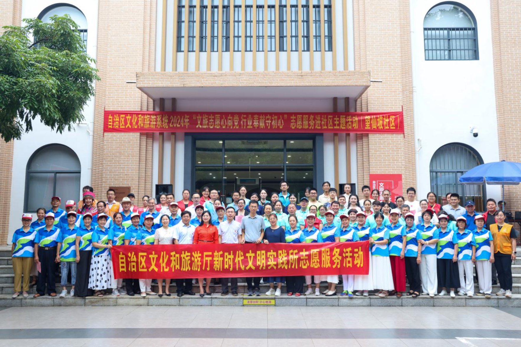 为宣传贯彻党的二十届三中全会精神,积极响应习近平总书记关于推动志愿服务体系建设和优化文化服务、文化产品供给的重要指示,8月11日,自治区文化和旅游系统组织志愿者服务队在南宁市人民公园举办了“文旅志愿心向党 行业奉献守初心”志愿服务进社区主题活动。来自自治区文化和旅游厅机关、厅直属单位、文化和旅游行业社会组织、南宁市兴宁区民生街道望仙坡社区的近百名志愿者参与活动。