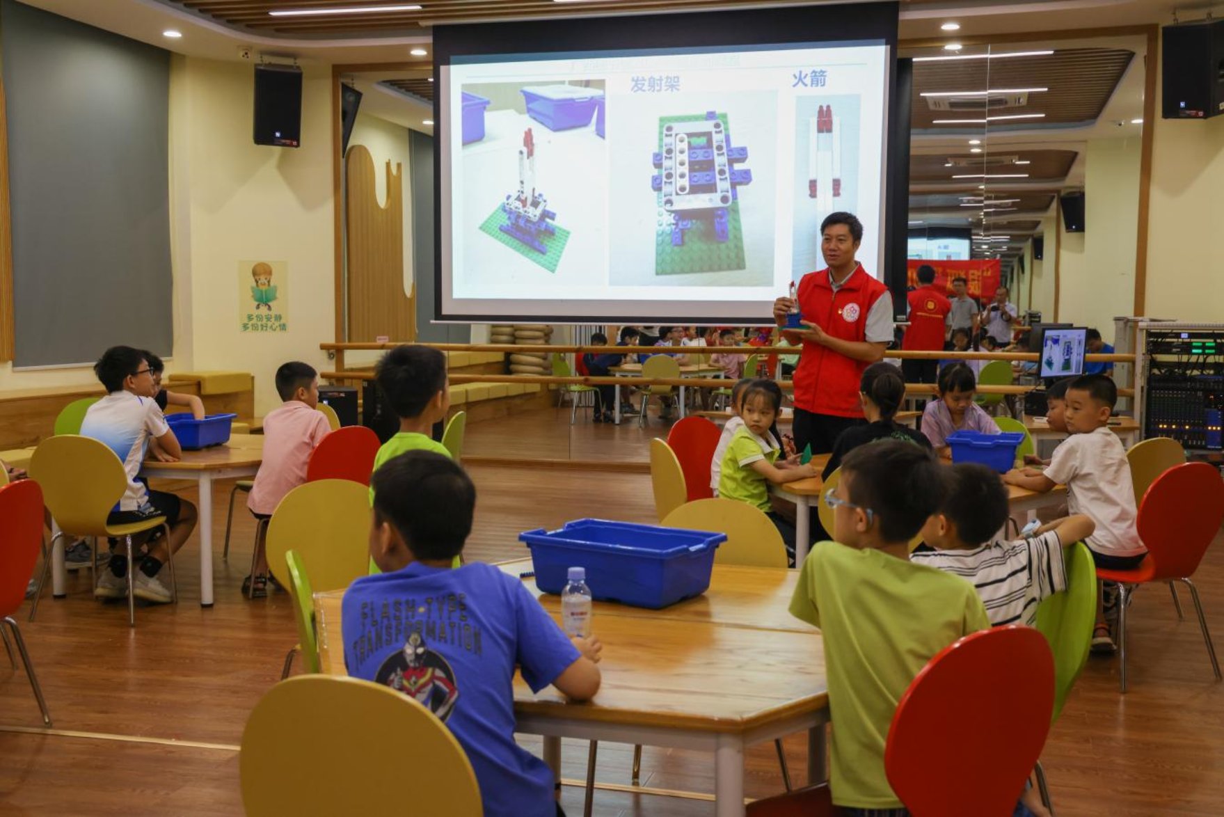 小朋友们在“银狐”机器人未来创客营学习搭建发射架与火箭模型