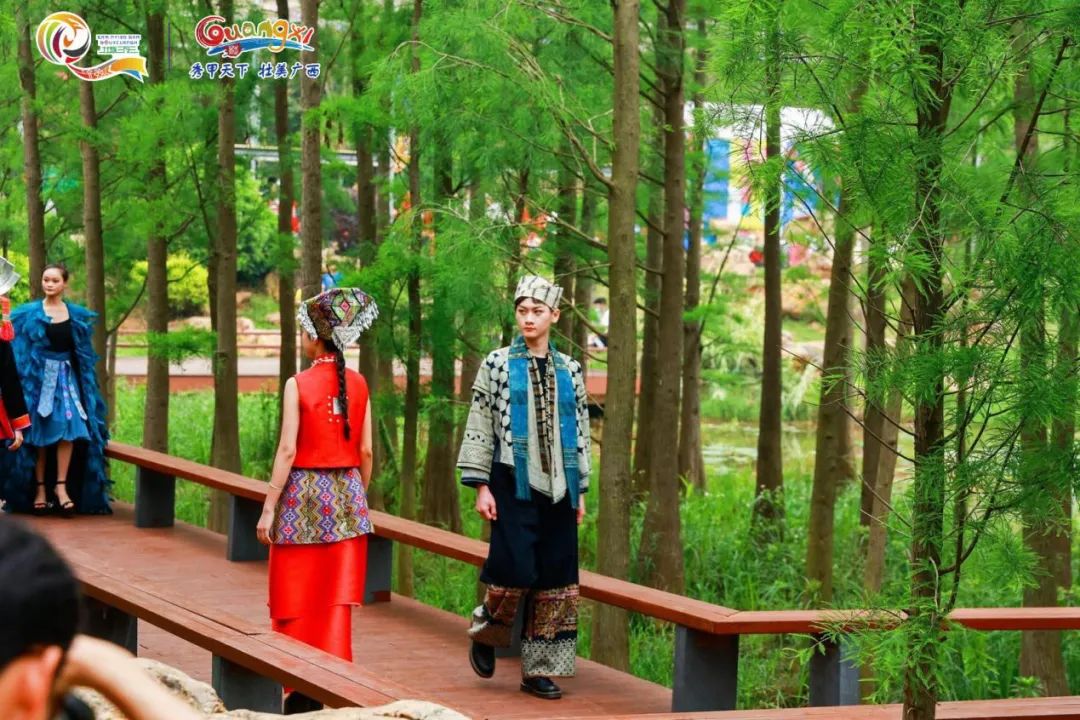 水光潋滟、林木葱郁、衣香鬓影,相映成趣……一个个身着少数民族盛装、民族潮服的模特穿行在湖畔高大笔直的杉树林间,为往来游客呈现了一场自然与人文和谐共生的民族服饰秀。作为“桂风壮韵浓”板块的重要活动之一,此次民族服饰秀从传统到现代、非遗技艺与时尚两个层面出发,通过展示服饰、银饰、配饰等多个种类组合,呈现了广西壮、苗、瑶、侗、彝等11个少数民族的40套传统服饰盛装,以及与新晋设计师合作创作的20套民族潮服,让观众在这篇章内更好地了解广西传统服饰文化、民俗文化。