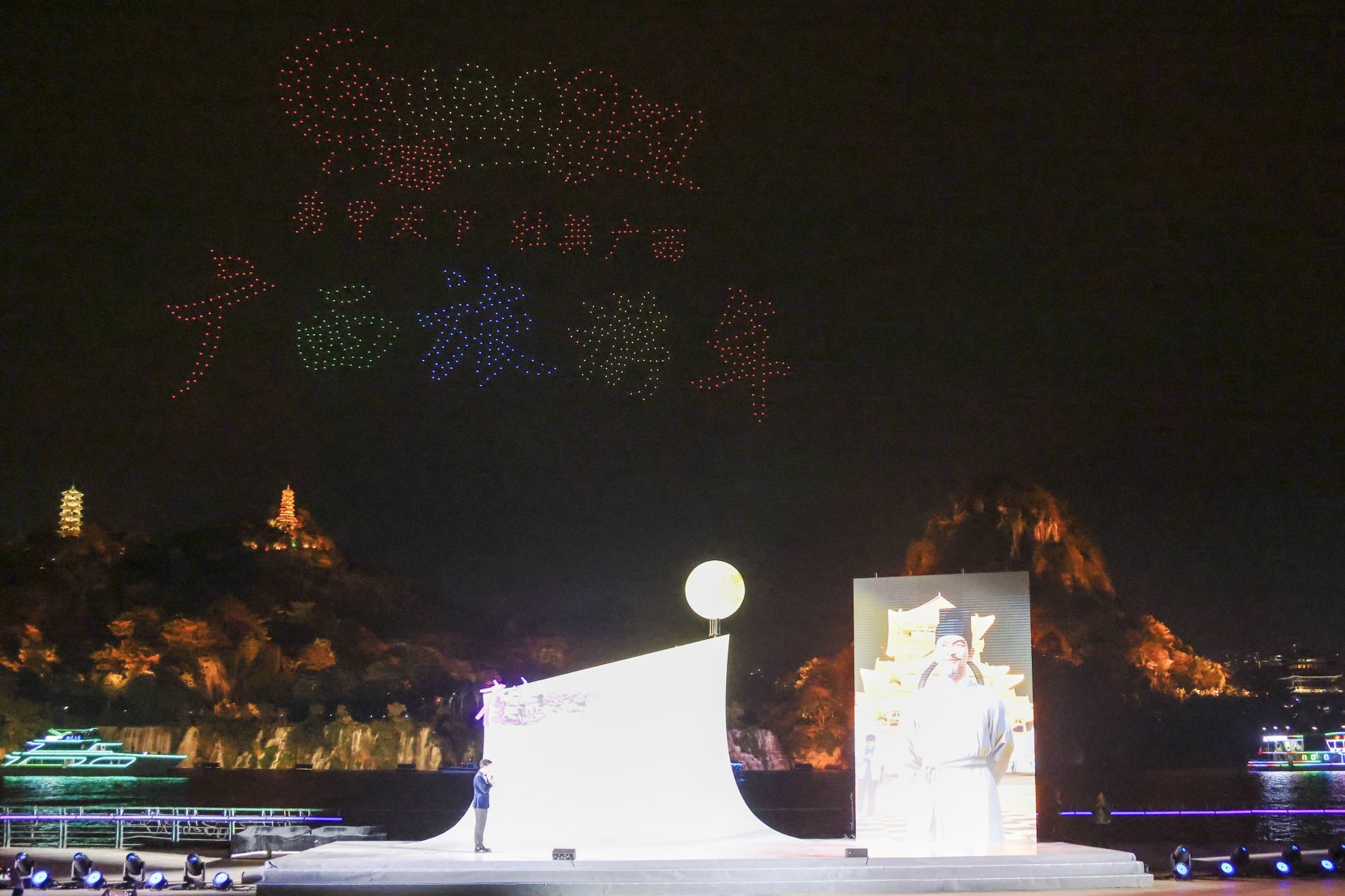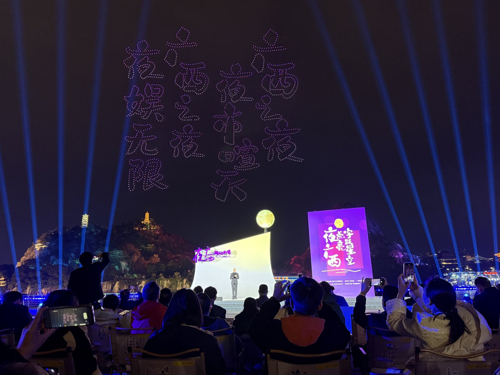 12月5日晚,柳江之畔,星光闪烁,灯火如昼。由自治区文化和旅游厅、柳州市人民政府、广西作家协会联合主办,广西日报社(广西日报传媒集团)、柳州市文化和旅游局承办的“字跃星空 点亮夜广西”无人机夜空表演暨“夜广西”游记大赛颁奖仪式,在柳州金沙角举行。自治区文化和旅游厅党组书记韩流,柳州市委副书记、市长刘胜友,广西日报社副总编辑陈仕平,广西作家协会党组书记、副主席程小华等出席活动,与来自全国各地的作家、媒体人及文学爱好者共赏柳江夜色,共话诗意夜广西。