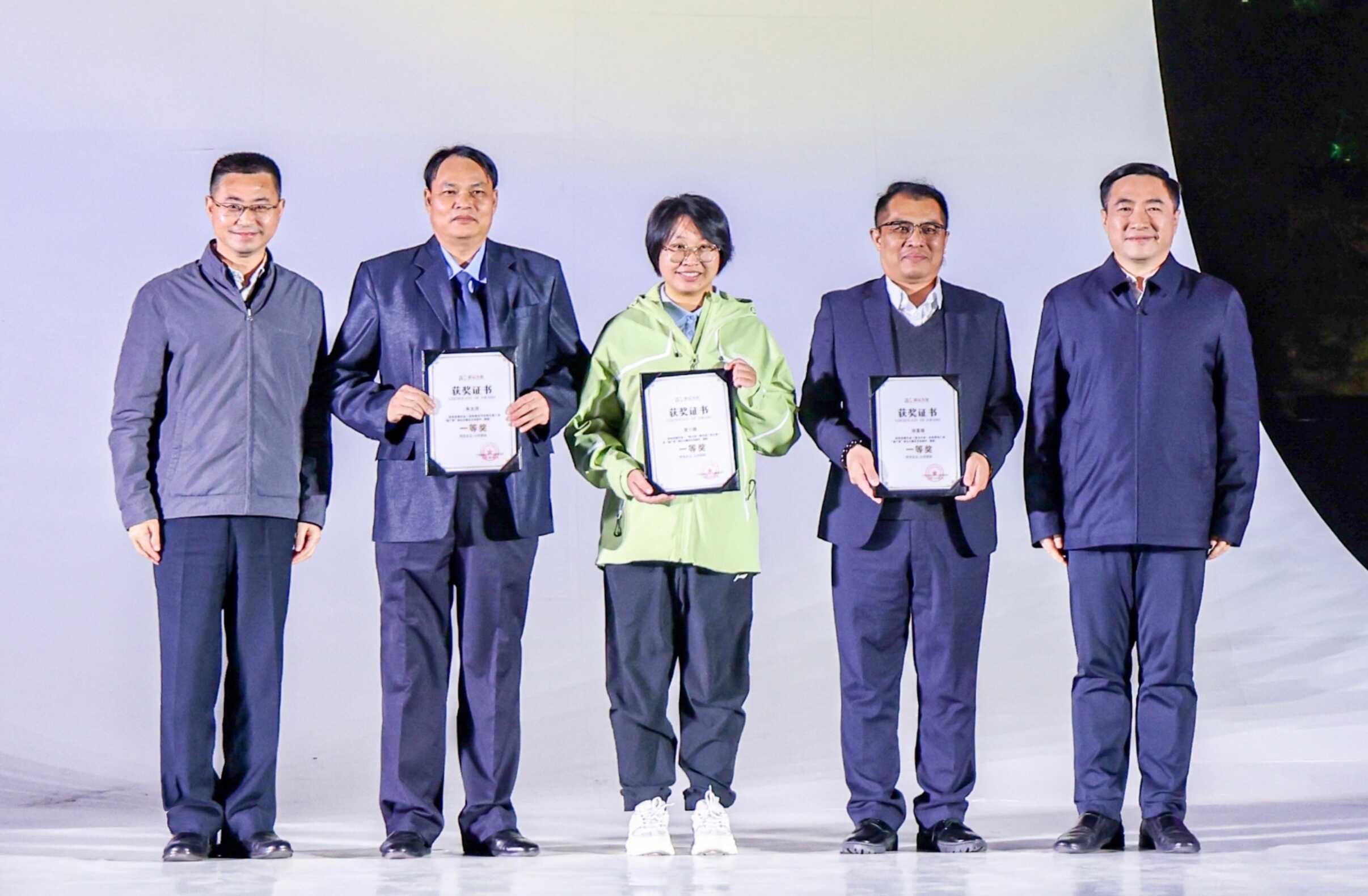 自治区文化和旅游厅党组书记韩流(左一),柳州市委副书记、市长刘胜友(右一)为一等奖获奖者颁奖