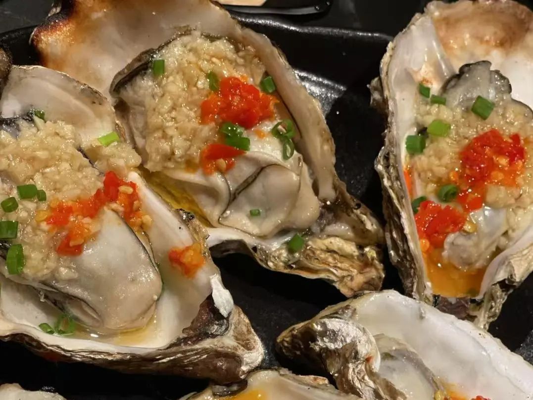 现开生蚝铺满蒜蓉酱,炭火烤至汁水沸腾,蒜香浓郁。
