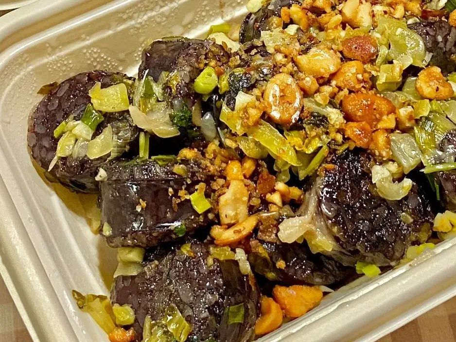 猪血混合糯米灌入猪肠蒸熟,切片油煎至外皮焦脆。