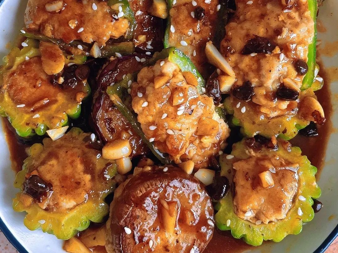 青椒、苦瓜、茄子掏空填肉馅,蒸制后淋豉油,荤素交融。