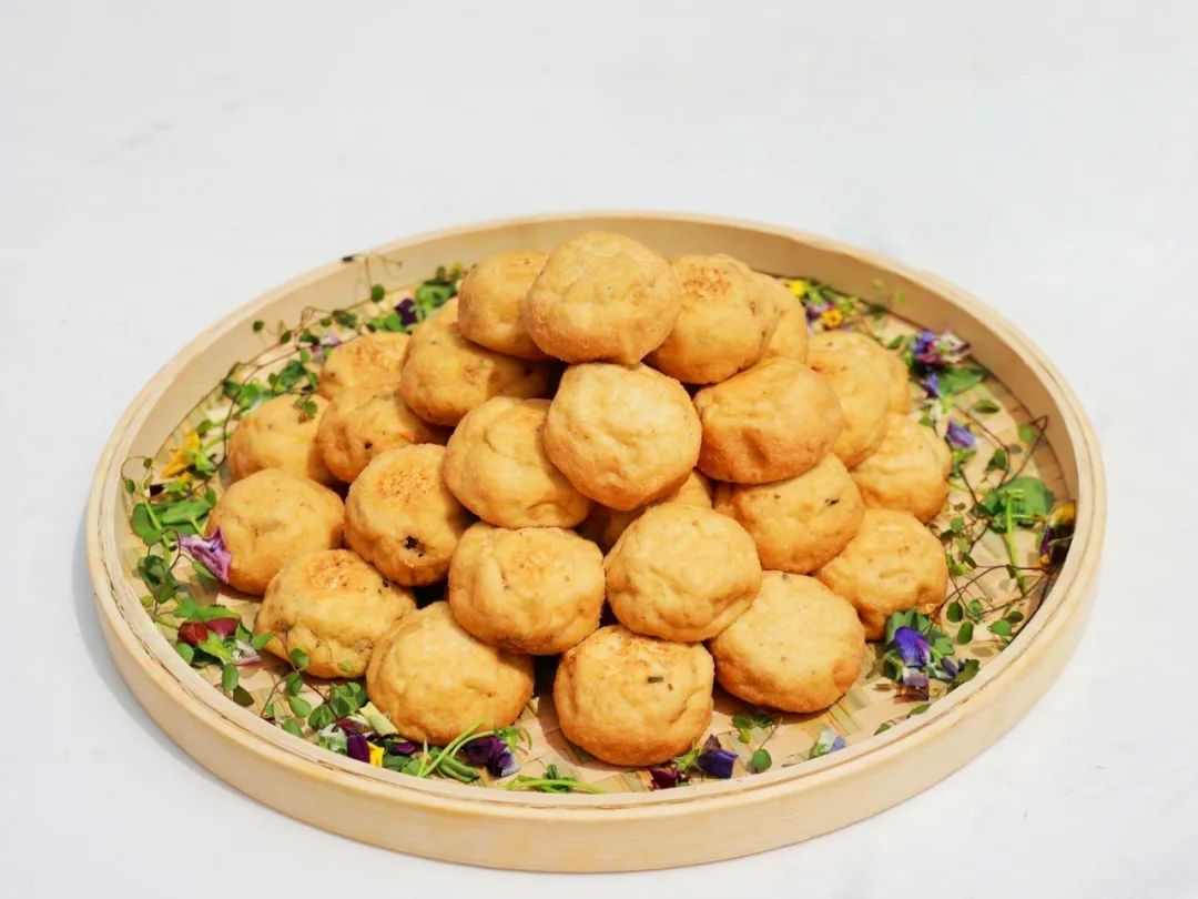 水豆腐捏碎混合肉末油炸,外皮焦脆内里柔软,形似金球。