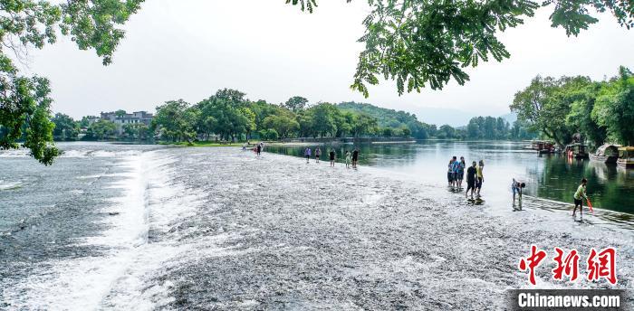 媒体行期间,记者来到灵渠景区大小天平处,只见水流顺坝而下,被粗糙的鱼鳞石坝面拱起无数银色浪花,远看如一条蜿蜒的银色绸带。在坝面光脚玩耍的市民游客有的举起水枪嬉戏,有的拍照留念,描绘出一幅夏日郊游的乐景。