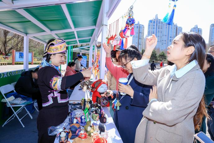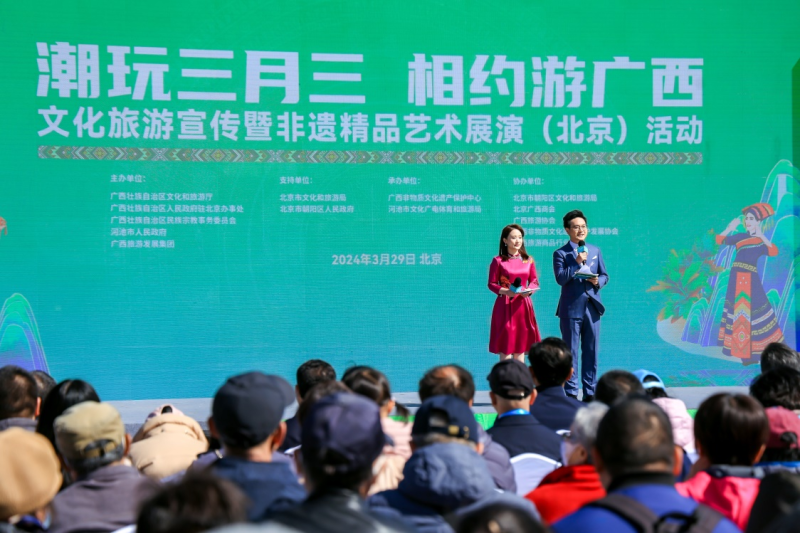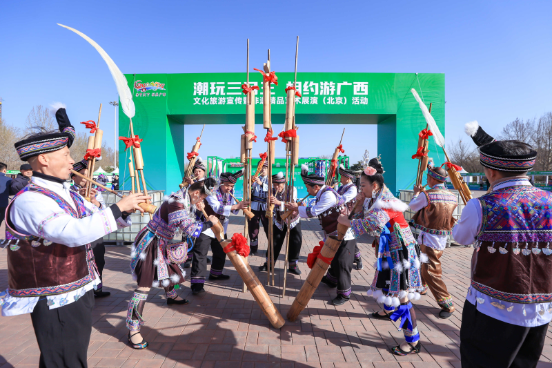 壮族竹竿舞、苗族芦笙、白裤瑶铜鼓舞……3月29日,在“广西三月三”即将到来之际,“潮玩三月三 相约游广西”文化旅游宣传暨非遗精品艺术展演(北京)活动走进北京市朝阳公园,通过非遗艺术表演、非遗技艺展示、非遗工艺品展览、非遗美食品鉴及精品旅游资源推介等精彩内容,为北京市民、游客带来了一场沉浸式“广西三月三”预告体验。