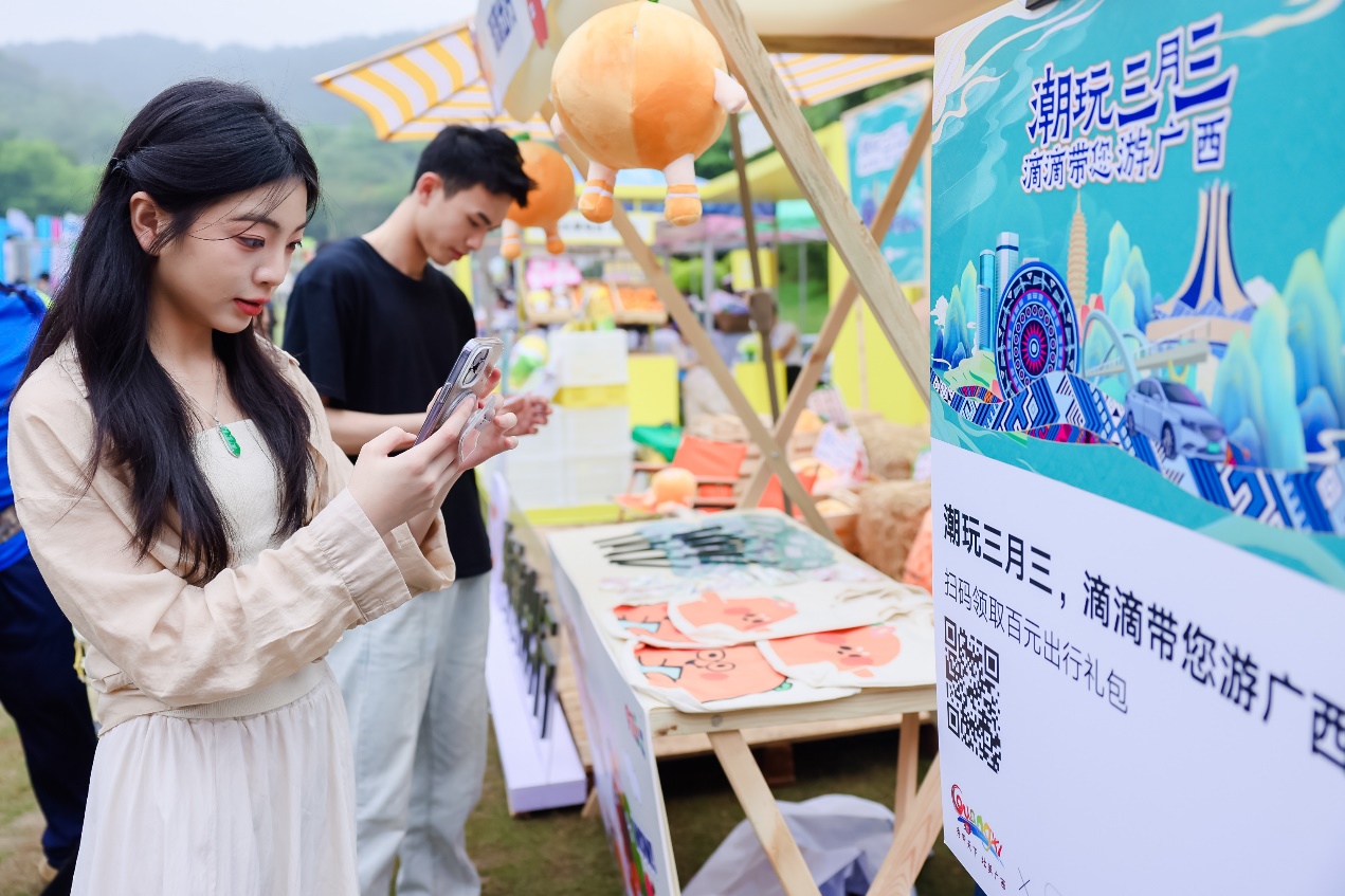 4月11日,在青秀山举办的“广西三月三·八桂嘉年华”开幕式活动中,“滴滴券包站”惊喜亮相现场,吸引众多游客现场打卡,扫码领取滴滴百元出行消费券包和周边礼品。
