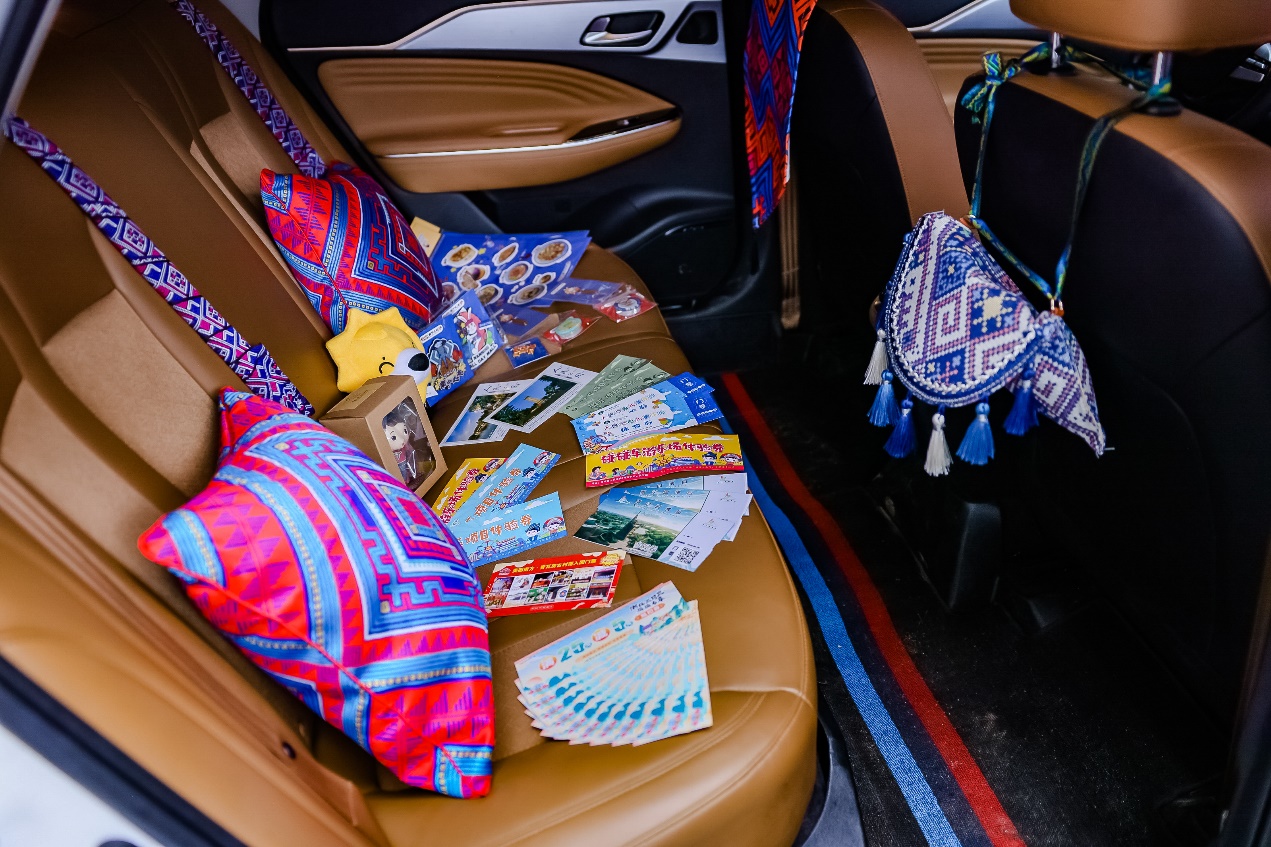 图为:彩蛋车内有文创周边、景区门票等礼品随机赠送给乘客