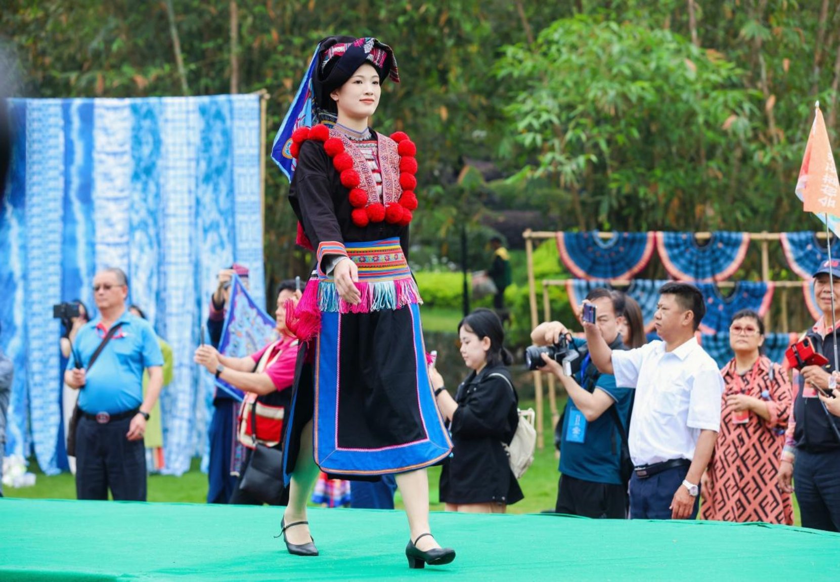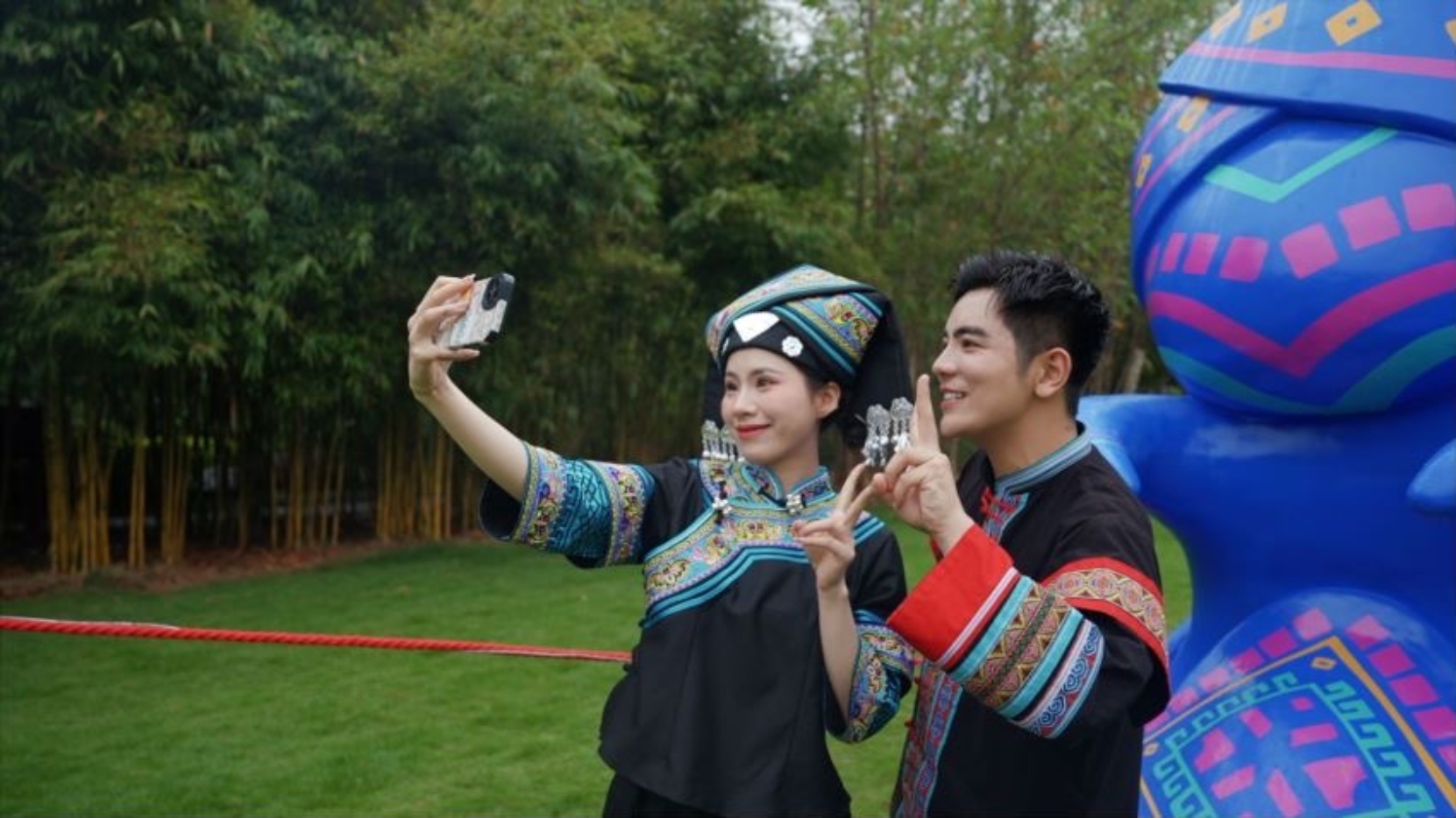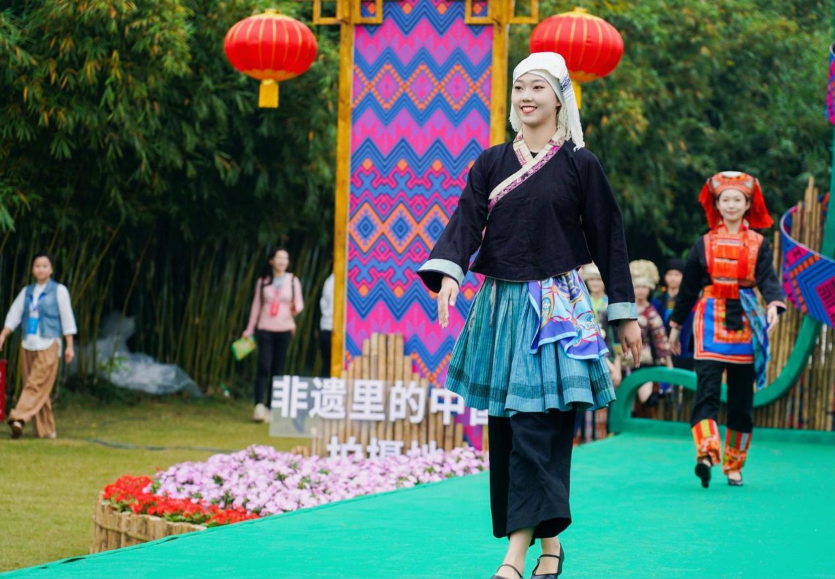 学过非遗技艺,草坪上还有“壮美霓裳”非遗服饰旅拍快闪店,游客可在这里观看精彩夺目的民族服饰走秀,学习鲜为人知的民族服饰小知识,还可以现场体验一下非遗服饰旅拍服务,换上壮族、侗族、瑶族、苗族等广西少数民族服饰来一组时尚大片,解锁朋友圈的“流量密码”。