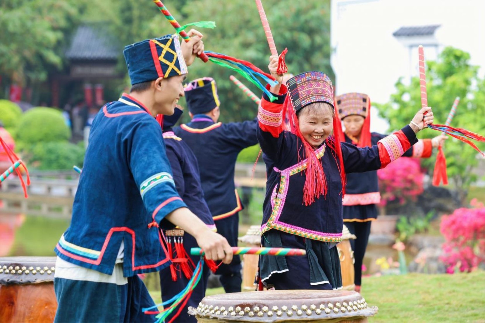 还未步入“广西三月三·八桂嘉年华”的街区大门,阵阵鼓声便已从远处悠悠传来。在“八桂鼓韵”民族习俗活动展演区,壮族铜鼓舞、瑶族长鼓舞热闹欢腾,悠扬的山歌时而高遏行云,时而百转千回,令人陶醉。热情好客的侗族同胞身着节日盛装,弹起欢快的琵琶,端起热气腾腾的油茶,唱起动听的侗歌,欢迎远道而来的客人。来往游客被侗族群众的热情好客所感染,纷纷上前互动,感受非遗歌舞表演的独特魅力。