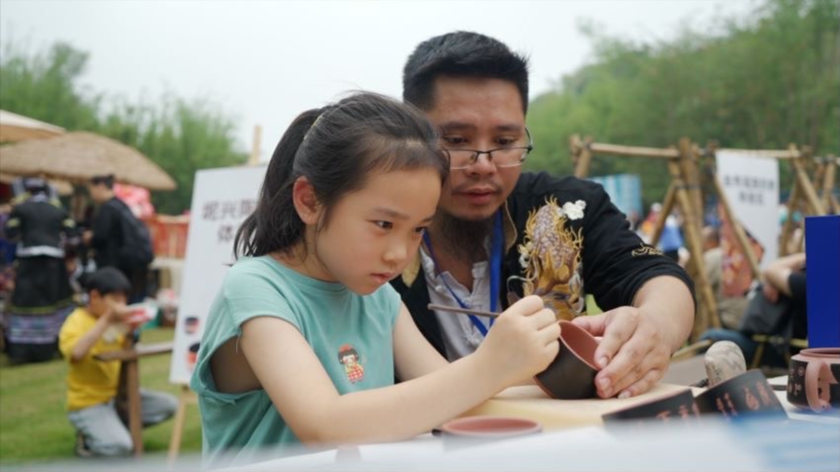 饱餐一顿后,穿越茂密的竹林,循着石板路一直向前,一片空旷的草地赫然呈现,这便是“壮美陶器”非遗技艺工坊、“非遗传艺”研学小课堂的所在地,这里展现着八桂大地各民族的审美情趣和艺术创造。坭兴陶制作技艺、壮族织锦技艺、金秀瑶族灯草灸疗法、苗族服饰制作技艺、右江壮族麽乜制作技艺等十余项非遗体验项目各具特色,让市民游客得以与非遗技艺近距离接触、与非遗传承人面对面学艺,延伸了非遗活态传承的更多可能性。