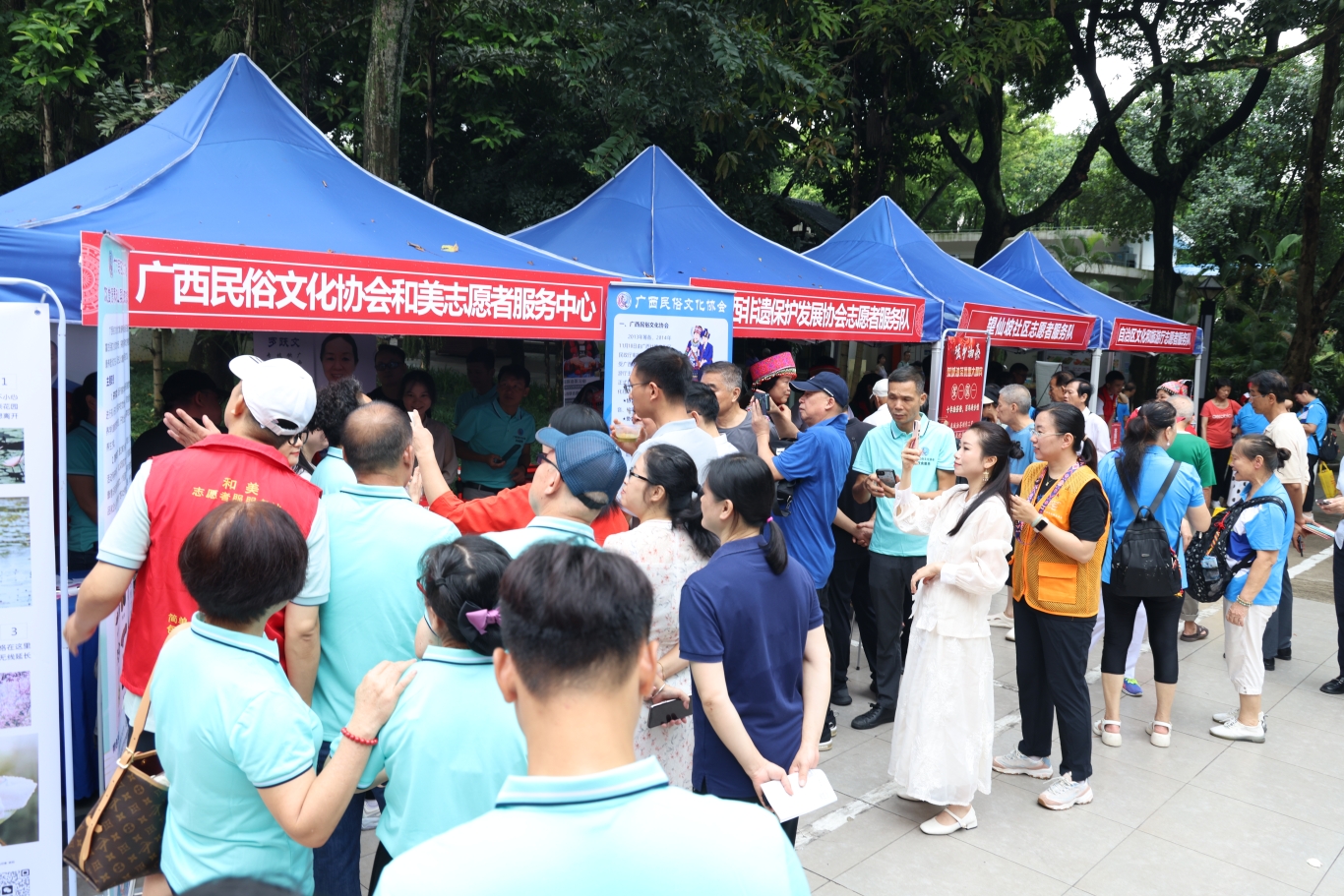 活动中,志愿者们根据单位业务特点分为多个小组,分别开展了文化宣传、普法教育、红歌教唱、非遗手作等丰富多彩的志愿服务项目。其中,自治区文化和旅游厅“一所五站”的志愿者们通过发放文明旅游和旅游普法宣传册、现场讲解、暑期研学课堂等方式,向市民游客普及了非物质文化遗产保护、旅游安全知识、文旅行业法律知识、广西精品旅游线路、科学文化知识等内容。13家自治区文化和旅游行业社会组织党支部参加此次活动,为市民游客提供了油茶非遗体验、广西民俗文化科普、养生八段锦教学、王阳明文化展示以及青年婚嫁咨询等内容。通过多样化的志愿服务,活动既展示了壮美广西的魅力,又增强了广大群众的文化自信和旅游安全意识,丰富文化生活,得到了社区群众和公园游客的一致好评。