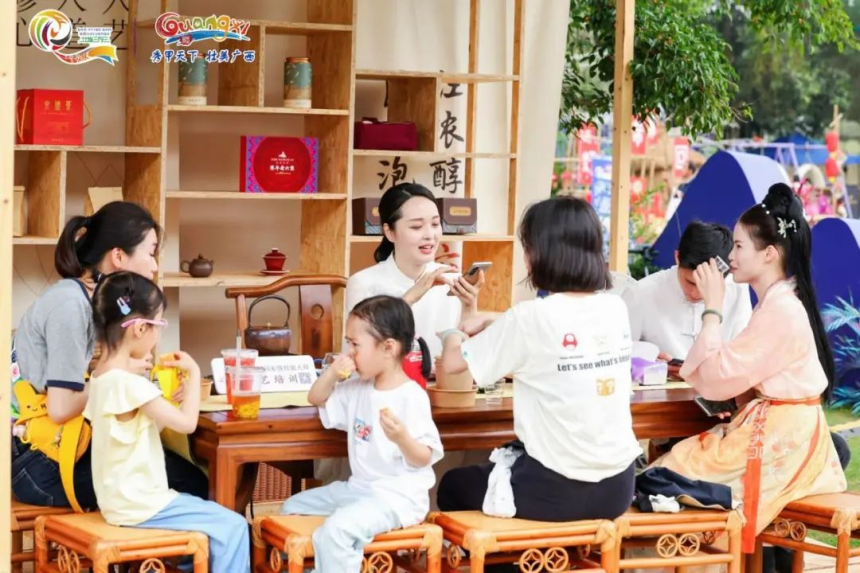 其中,广西文创潮玩精品展示体验区域集展示、销售、体验为一体,通过打造潮流咖啡车、国风饮茶、露营生活等多个场景,展示“广西有礼”中国旅游商品大赛金银铜奖作品、广西博物馆100件精品文创、钦州坭兴陶设计师系列作品、广西茶文化传承品牌、天等壮族霜降文化节系列文创产品、广西民族国潮饮品品牌等。而文旅露营休闲生活体验区则通过旅居露营场景的搭建,融合文旅消费内容,向嘉宾及游客呈现了广西多元的茶文化、饮食文化、服饰文化元素。这些文创潮玩精品和文旅消费新方式将传统民族文化融入时尚文旅生活,在传播传统文化内涵的同时促进了文化旅游消费升级。