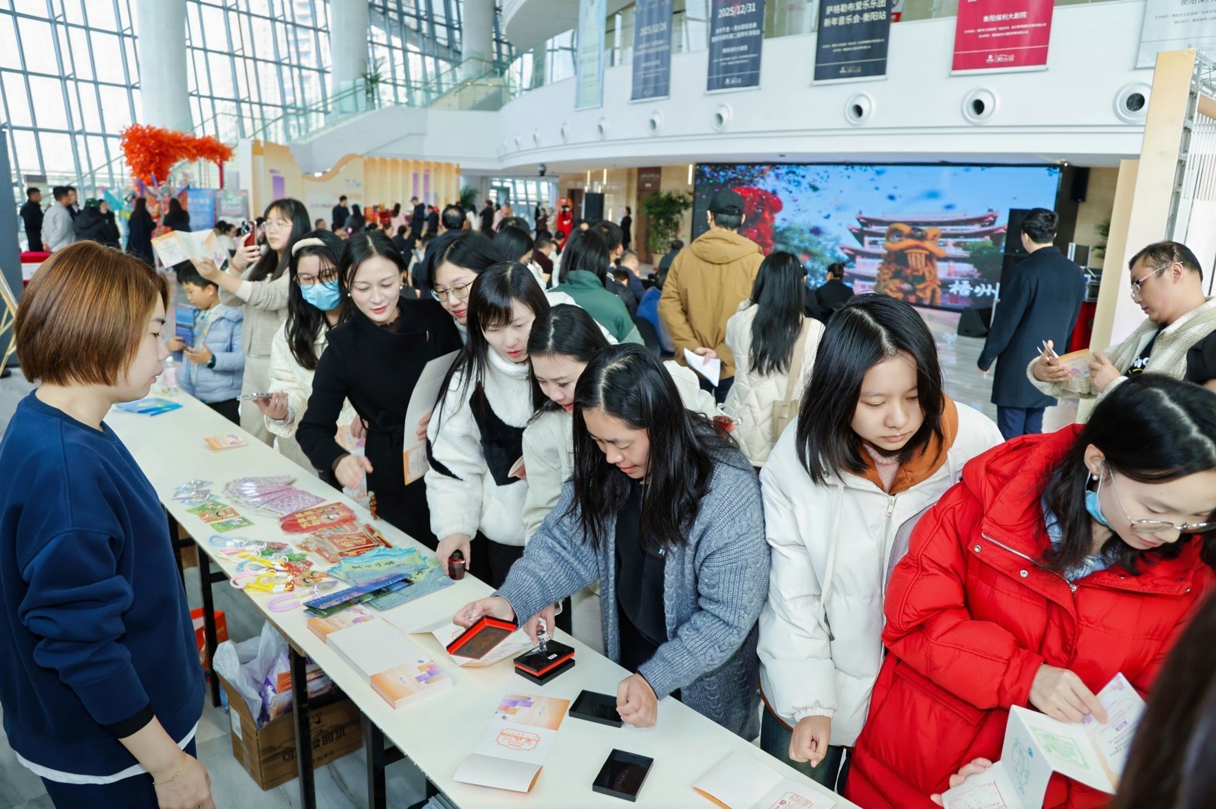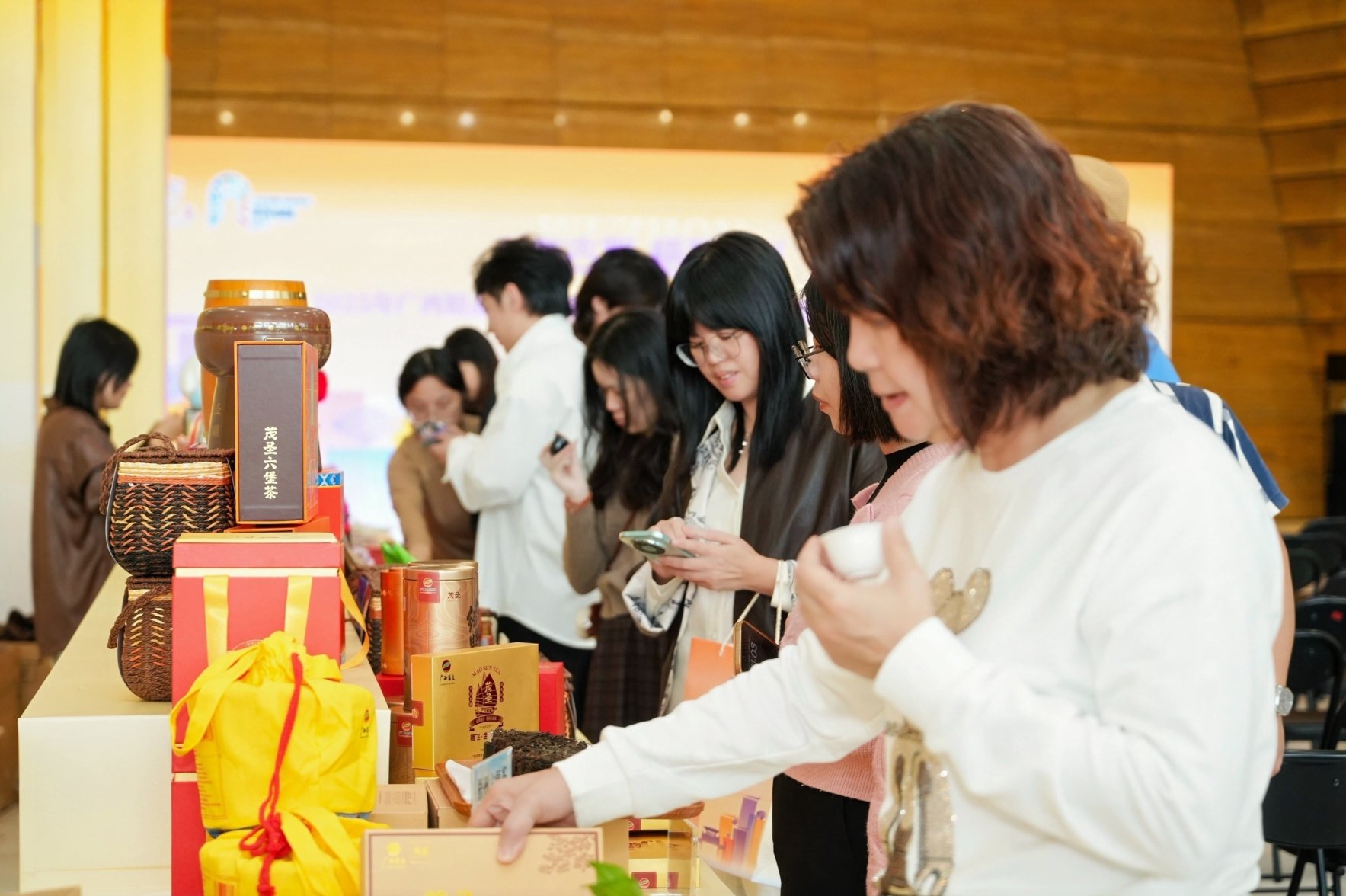 为增强观众的参与感和体验感,活动特别设置了主题展示区和互动打卡环节。茶艺师现场冲泡六堡茶,配合纸包鸡、龟苓膏、冰泉豆浆等非遗美食,以及人工宝石、藤县狮舞、特色文创等文旅商品展示展销,让大家能够在品茗、逛展、赏艺中近距离感受梧州文化魅力。现场气氛热闹,大家纷纷上前打卡。