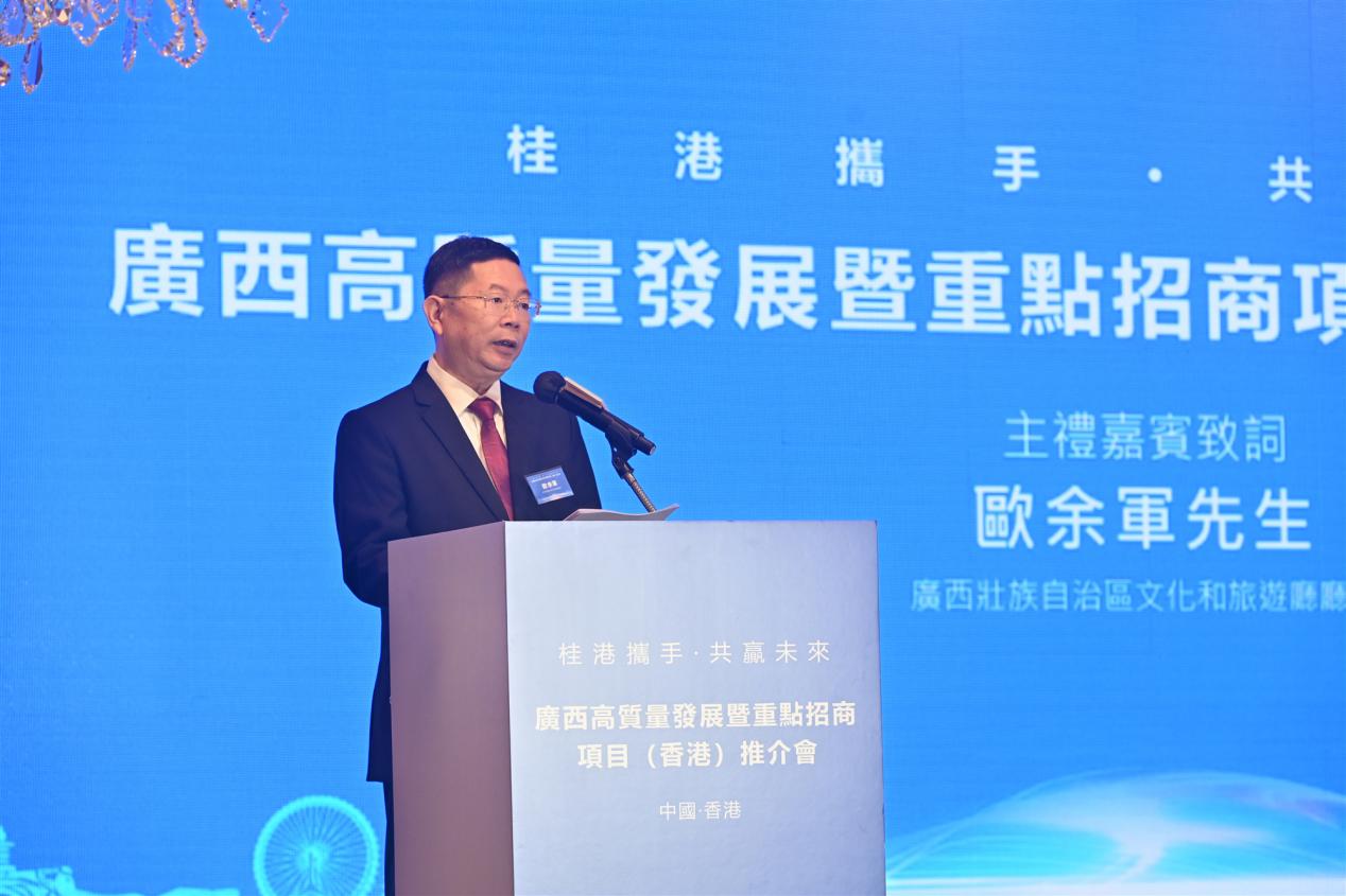 欧余军在“桂港携手共赢未来”广西高质量发展暨重点招商项目(香港)推介会上推介广西大健康和文旅产业