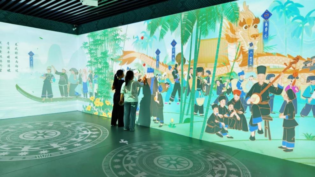 “穿越”歌圩场景。“廖江竹枝词”沉浸式互动空间利用MR技术、多模态感知和光粒级3D动态渲染,打造出虚实交融的沉浸式互动空间。读者触碰感应点,便可在光影声电的交织中瞬间置身原生态歌圩的热闹场景,感受晚清诗人韦丰华笔下 “三月三”民俗图卷。此外,展厅融入了VR、点触、体感感应等多种技术,让阅读成为“随时随地、因你而动”的文化体验。