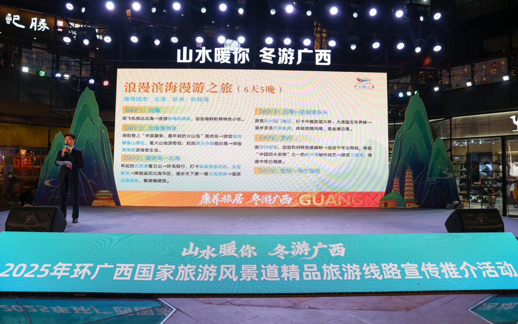 12月18日晚,在充满活力的阳朔益田西街,“山水暖你 冬游广西”2025年环广西国家旅游风景道精品旅游线路宣传推介会精彩举办,将整个主题活动推向高潮。现场通过震撼的文旅宣传片、生动的线路推介、特色浓郁的地方文艺表演以及旅拍活动精彩花絮的播放,向线上线下观众系统推介了“山水栖心・慢旅桂林”主题线路、“冬游广西”精品自驾旅游线路等一批精品旅游线路。