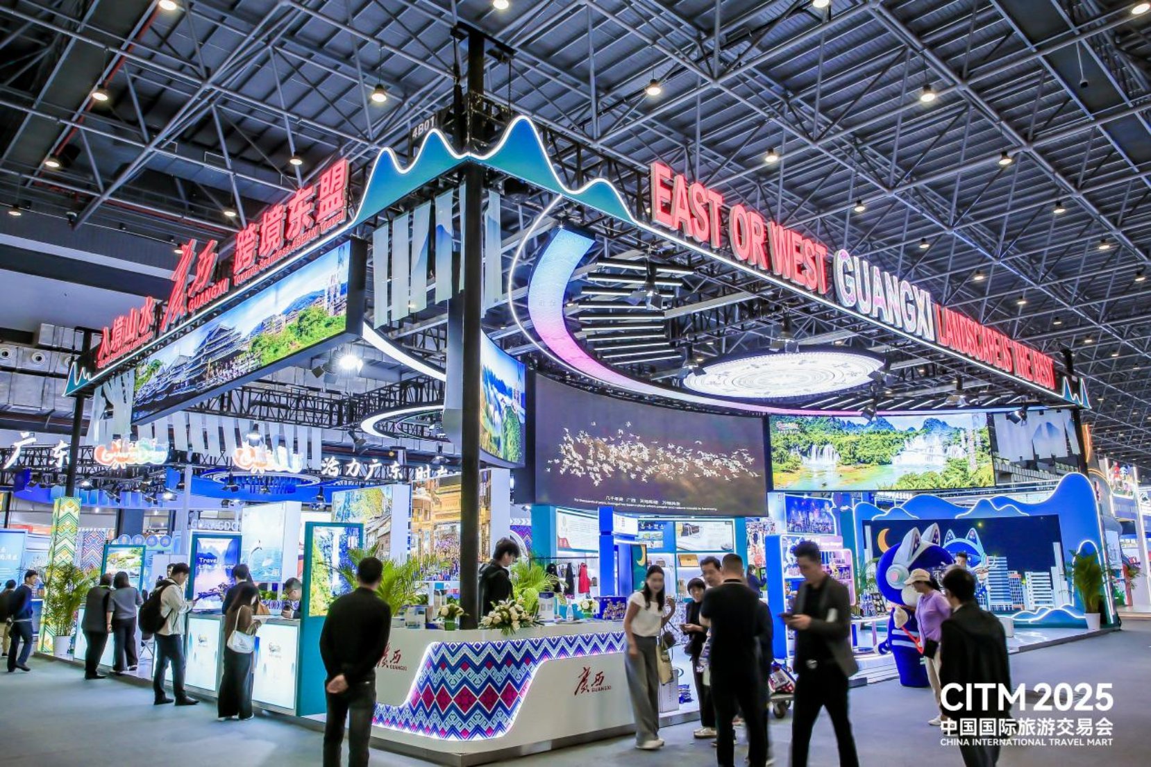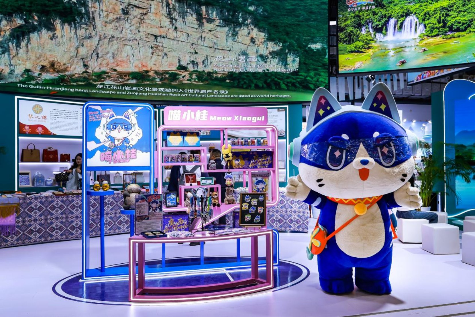 文旅企业展示洽谈区,聚焦旅游投资集团、旅行社、景区、科技、文创等板块,打造一站式跨境文旅合作对接平台。其中,桂林旅股、桂林假期旅游集团、巴马寿乡旅游等旅游投资集团,集中展示旗下核心项目,全面呈现“山水+康养+文化”融合发展的主题产品;中国国际旅行社、康辉旅行社等近10家知名旅行社,重磅推出广西旅游及跨境旅游线路,为游客提供实用指南;德天跨国瀑布景区、涠洲岛景区推出特色主题产品,为游客打造多元出行选择;“一键游广西”智慧平台同步亮相,游客可通过“一键游广西”和“一键游东盟”小程序,实现景区门票购买、酒店预订、线路规划等一站式便捷体验;以两广地区特色的雀猫为原型的“活力夜广西”官方IP形象“喵小桂”带来冰箱贴、钥匙扣、玩偶等衍生文创,以呆萌可爱的形象备受游客瞩目。