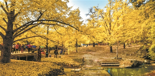 当下正是银杏观赏黄金期,村落的田园间、村舍旁、道路边,一簇簇、一片片的金色银杏十分耀眼,前来观赏的游人如织。