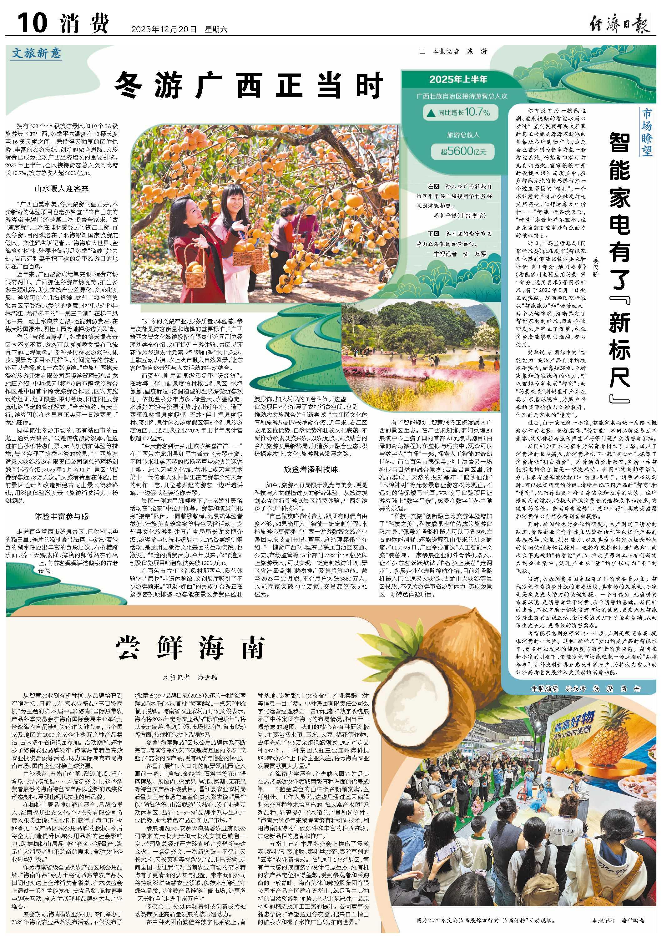 “自己做攻略费时费力,跟团有时候自由度不够,如果能用人工智能一键定制行程,来桂旅游会更便捷。”广西一键游数智文旅产业集团党总支副书记、董事、总经理廖伟平介绍,“一键游广西”小程序已联通自治区交通、公安、市场监管等13个部门,288个4A级及以上旅游景区,可以实现一键定制旅游计划、景区客流量监测、购物推广及售后等功能。截至2025年10月底,平台用户突破3880万人,入驻商家突破41.7万家,交易额突破5.31亿元。
